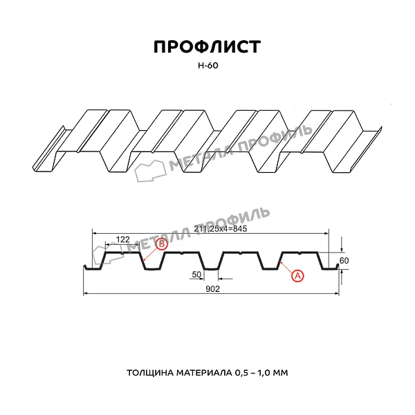 Профлист МЕТАЛЛ ПРОФИЛЬ Н-60x845-A NormanMP (ПЭ-01-9006-0,5) часто используется для обустройства профилированного листа. Изначально он представляет собой лист оцинкованной стали с покрытием. Толщина металла с цинковым и декоративно-защитным покрытием составляет 0.5 мм. Проходя процедуру холодного проката, металл принимает волнообразный вид. Такая конфигурация придает профилю жёсткость.